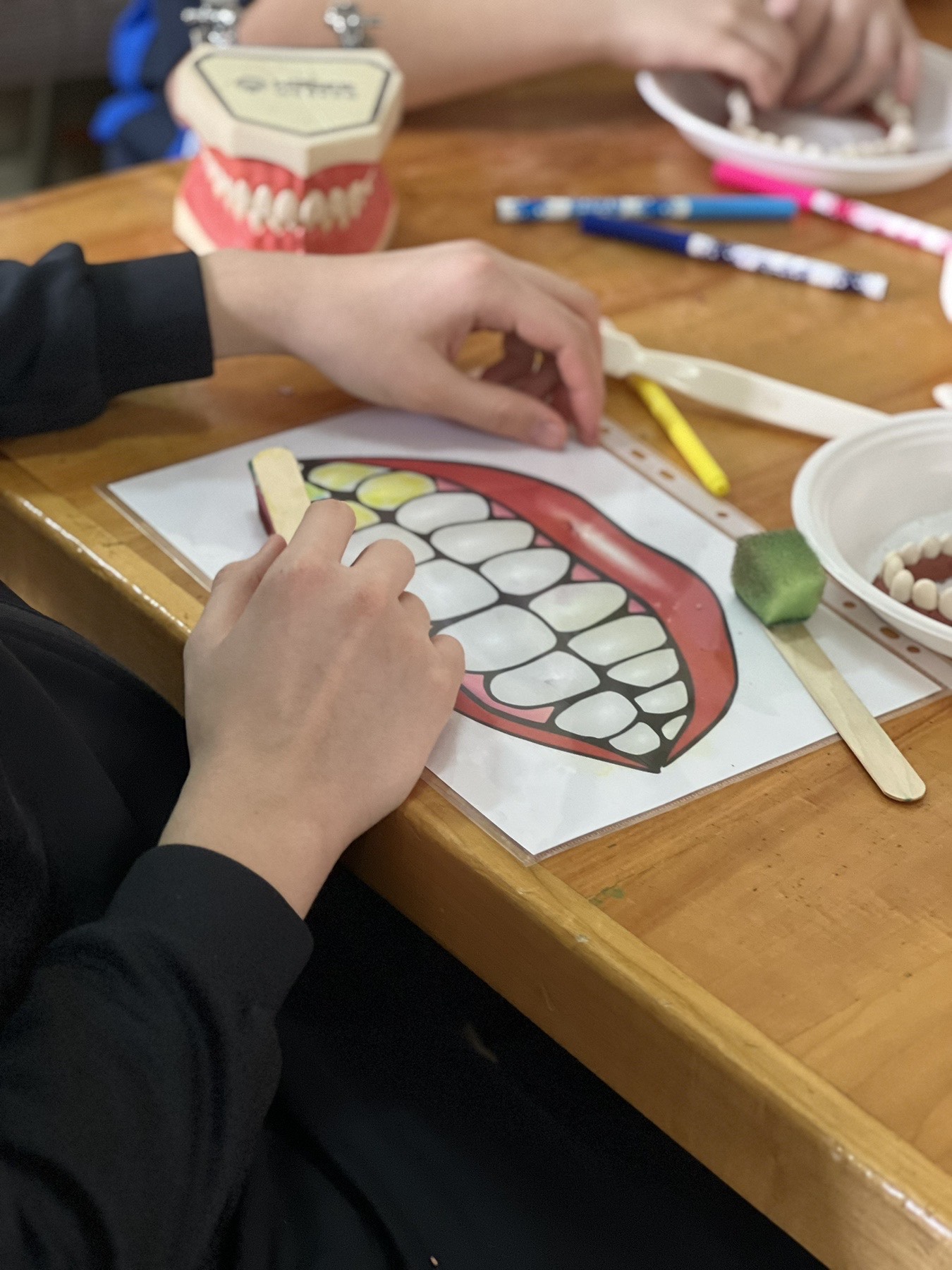 Dr Budišić je za naše učenike pripremila edukativnu radionicu, tako da su oni kroz praktične primjere mogli da uoče kako neke loše navike negativno utiču na zdravlje zuba, a potom im je skrenula pažnju na pravila oralne higijene. Učenici su aktivno učestvovali u jednostavnim ogledima tako što su npr. od crvene gline i bijelih zrna pasulja izrađivali vilicu, zubiće su bojili a potom četkicom uklanjali nečistoću. Kroz eksperiment s jajima, djeca su bolje razumjela priču o tome na koji način kiseline, nastale nakon razlaganja šećera u usnoj šupljini, razaraju zubno tkivo i kako zapravo nastaje karijes. Naime, ljuska jajeta podsjeća na naše zube, a djeca su pred sobom imala zdravo jaje i jaje koje je prenoćilo u sirćetnoj kiselini, čime je izgubilo uobičajenu tvrdoću. Takođe na modelu vilice uvježbavali su pravilnu upotrebu zubnog konca prilikom čišćenja.